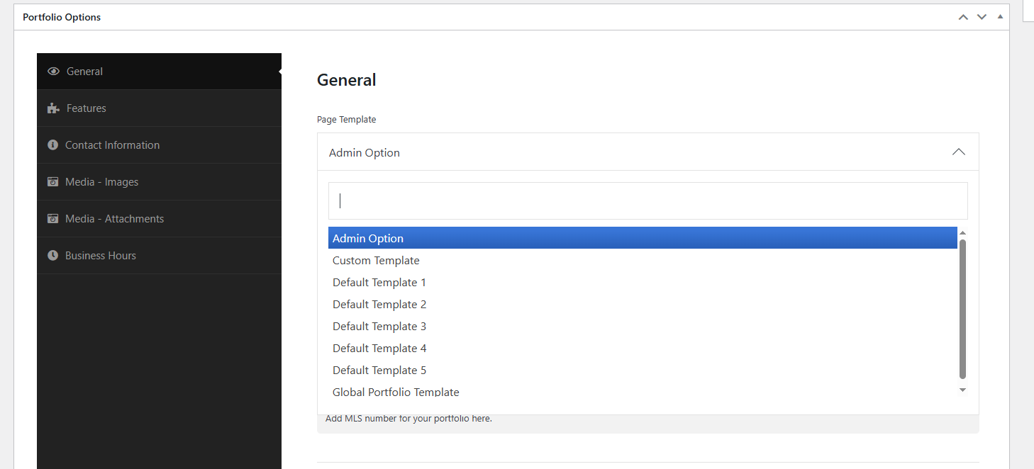 If you select "Admin Option", the system will use the template set under: Dashboard -> Portfolio → Settings → General (tab) → Portfolio Single Page Template