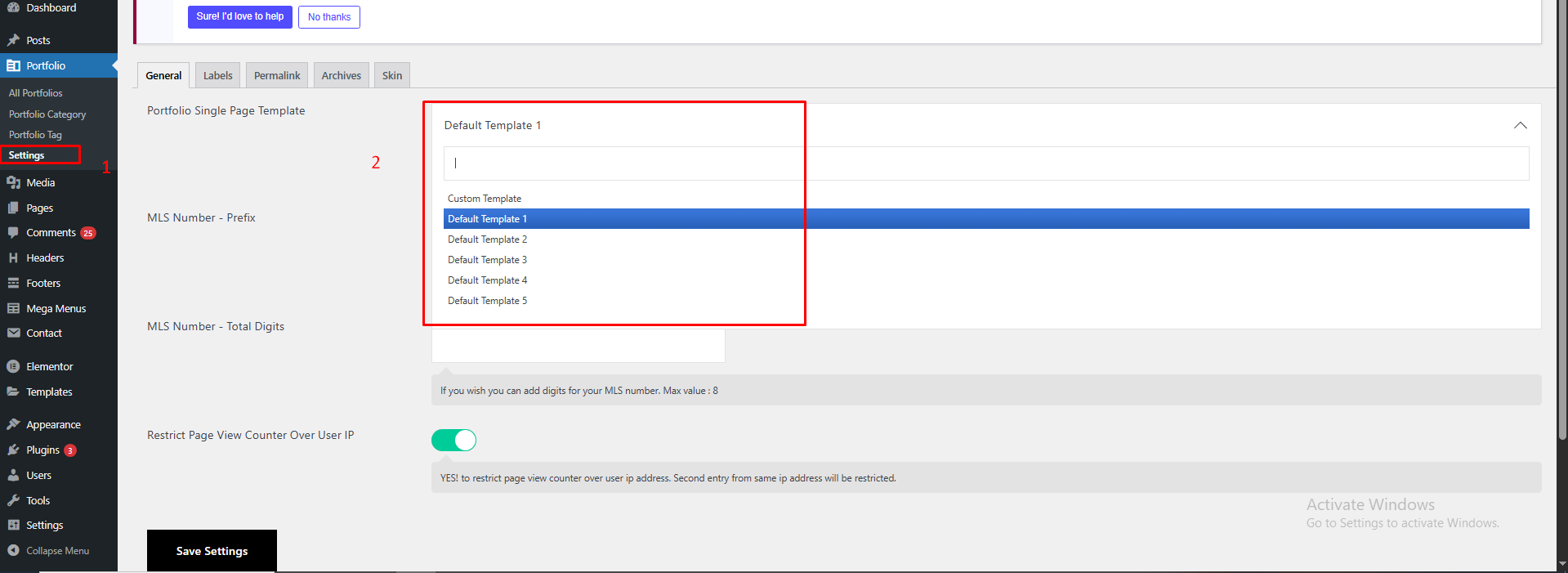 Now go to: Portfolio Options → Settings → General (tab) → Page Template and select your newly created page (e.g., "Global Portfolio Template") as the global template. Refer to the image above for reference.
