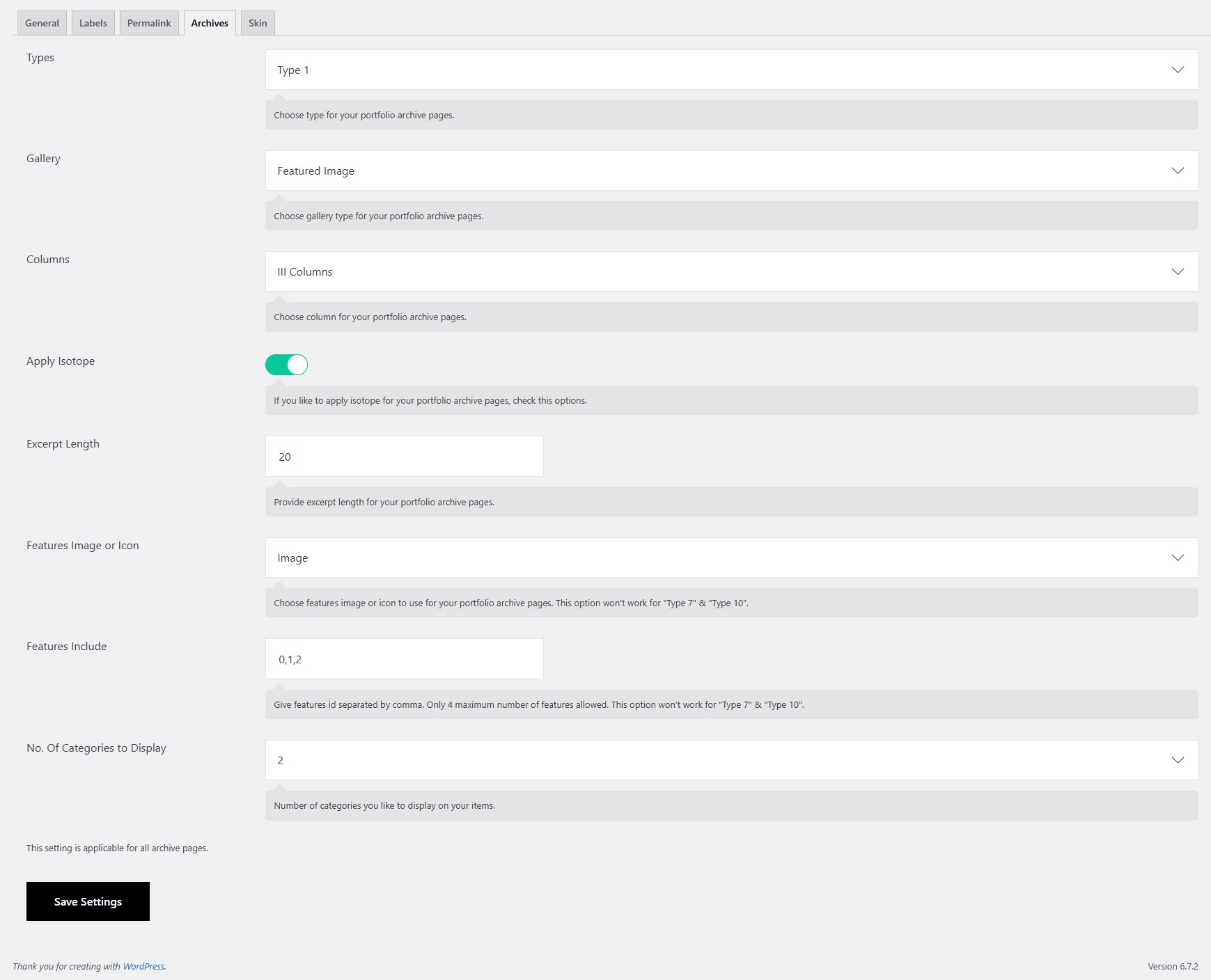 Types: Select a layout style for displaying your portfolio archive pages. Each type defines a different design and structure.