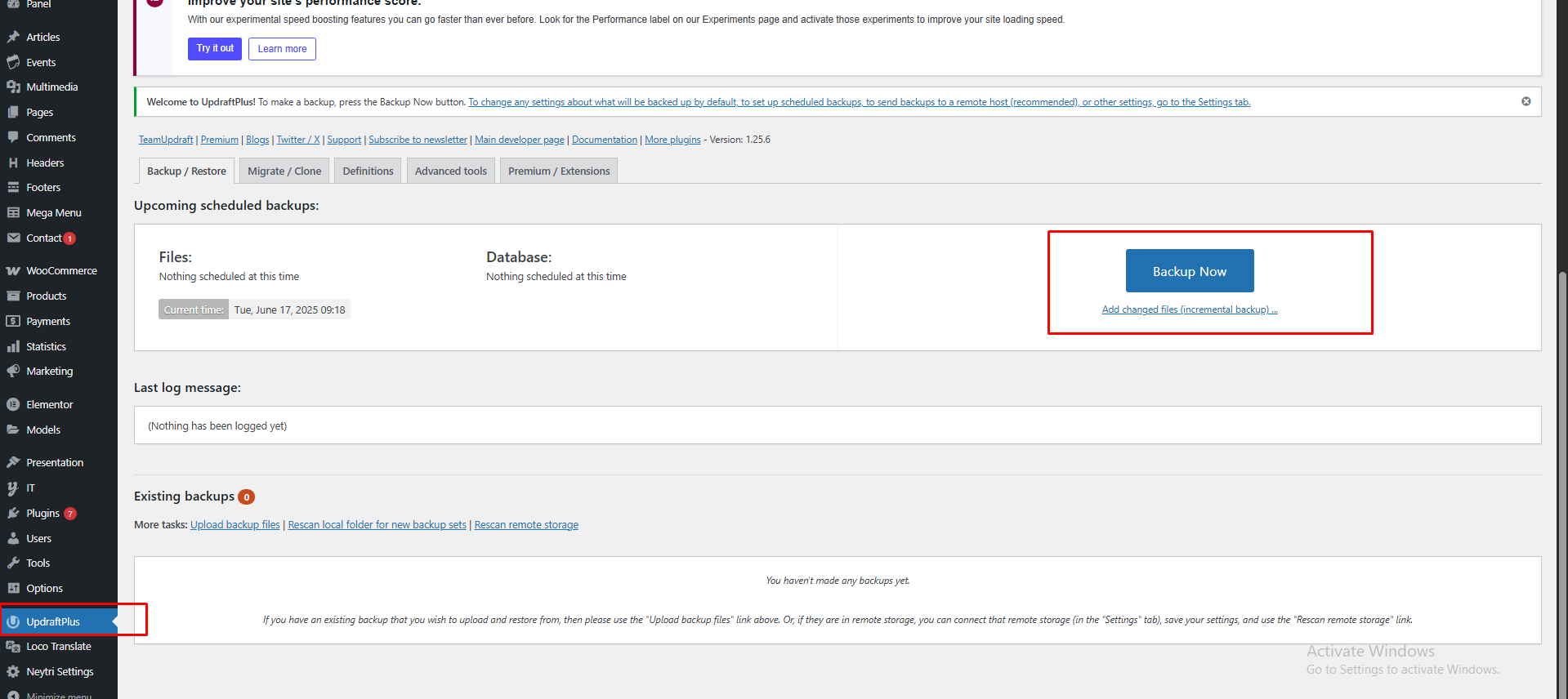 Click Backup Now and select Files + Database.