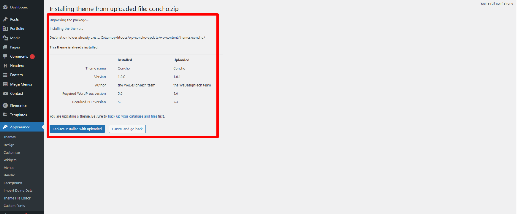 .zipfile.When prompted, click “Replace current with uploaded” to install the latest version.